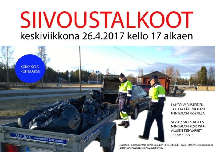 Koko kylän yhteiset siivoustalkoot pidetään tänä vuonna keskiviikkona 26.04.2017. Lähtökahvit, reitit ja varusteiden jako Niinisalon kioskilla kello 17. Tervetuloa mukaan mukavaan yhdessäoloon ja kuntoiluun puhtaanapidon merkeissä vaikka koko perheen voimin!